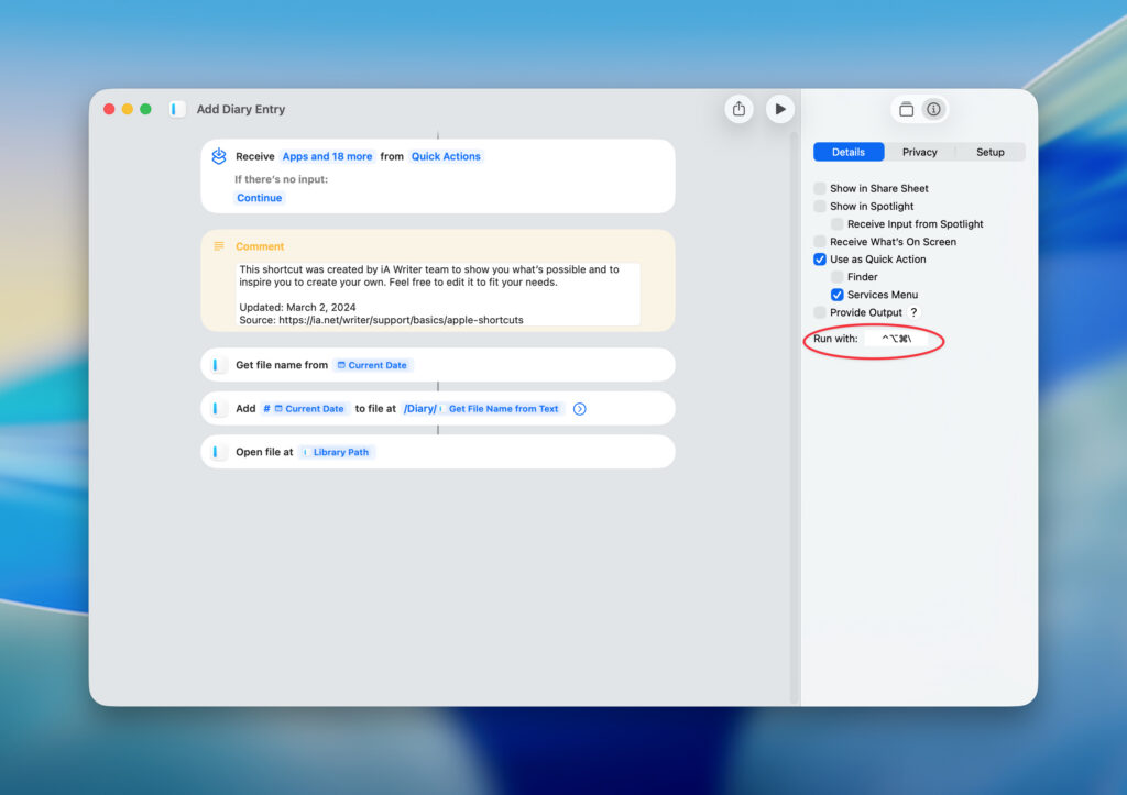 点击使用 Shortcuts 并不方便,可以将其设置为快捷键(如下图所示)。